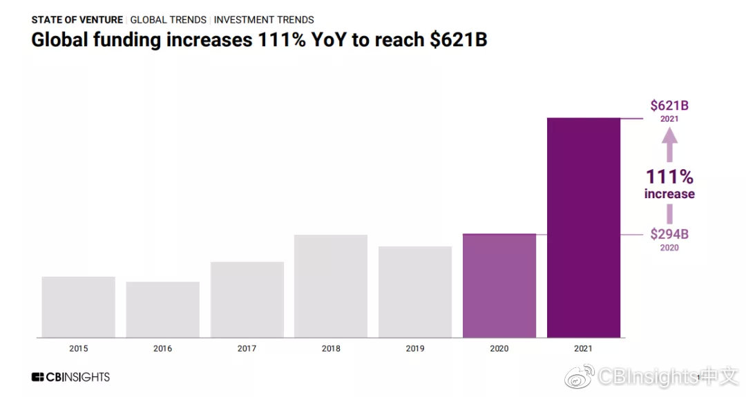 在各國央行史無前例的寬松貨幣政策與過剩的流動性趨勢下,疫情并沒有阻礙 2021 年風(fēng)投腳步。2021 年全球融資達 6210 億美元,較 2020 年的 2940 億美元增長逾一倍。
