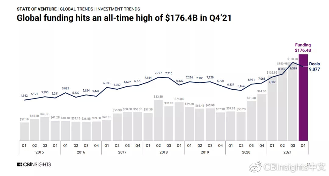 2021 年 Q4 以 1764 億美元投資金額完美收官,這是自 2020 年 Q3 以來投資金額連續(xù)第六個季度實現(xiàn)正增長。