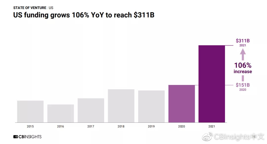 圖 | 2015 年至 2021 年美國融資金額變化(來源:CB Insights)