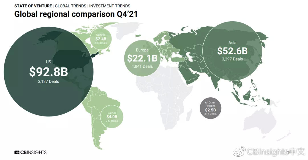 圖 | 2021 年 Q4 全球各地區(qū)投資交易數(shù)量和金額(來源:CB Insights)