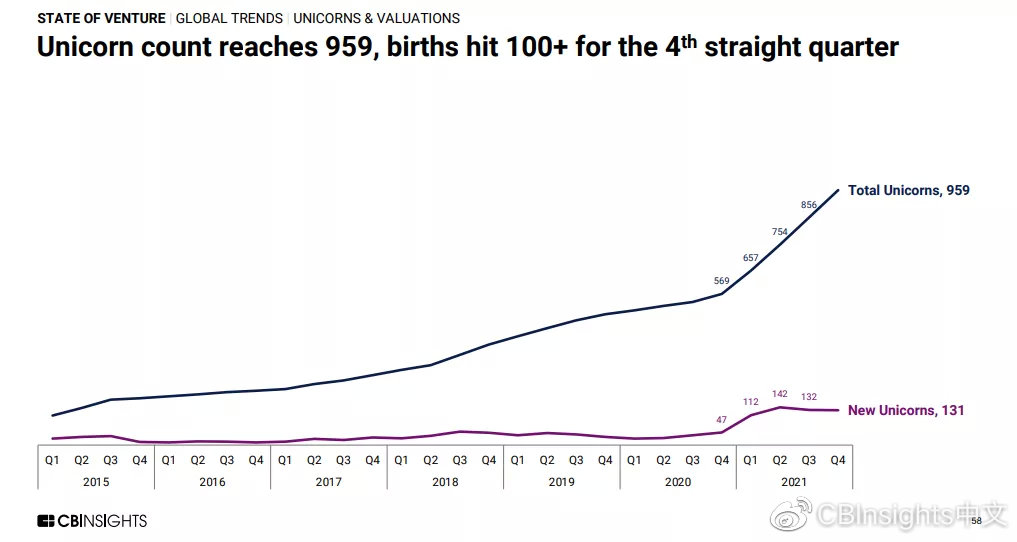2021 年 Q4 新晉 131 家獨角獸公司,史上排名第三,僅次于 2021 年 Q2(142 家)以及 2021 年Q3(132 家)。