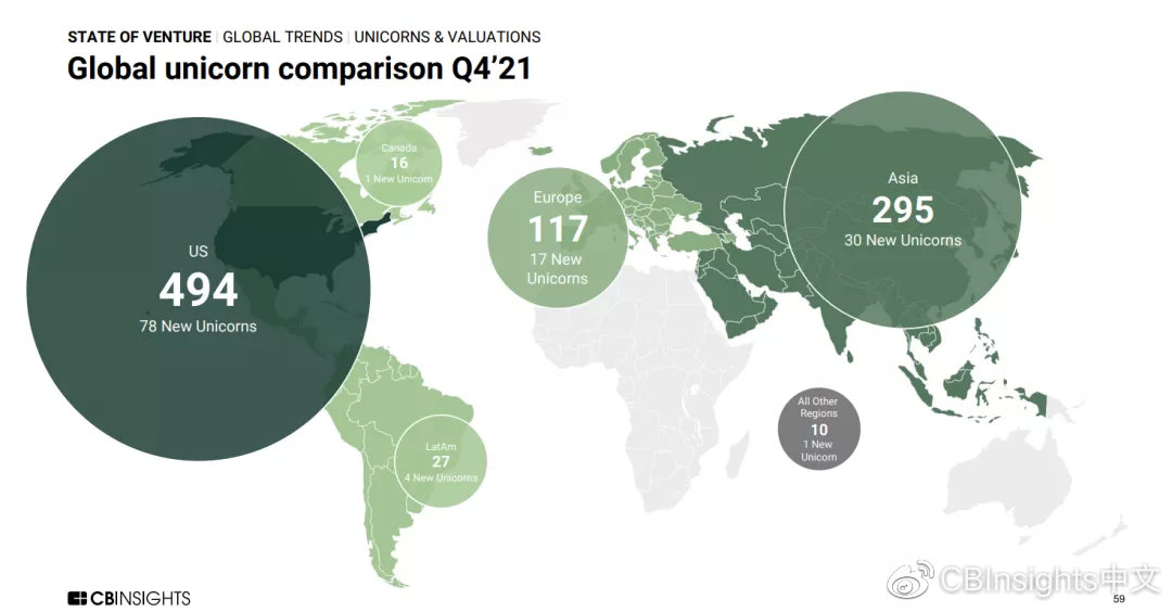 截至 2021 年,全球范圍內(nèi)獨角獸企業(yè)共計 959 家。美國地區(qū)位居首位,有 494 家獨角獸;亞洲緊隨其后,有 295 家獨角獸。