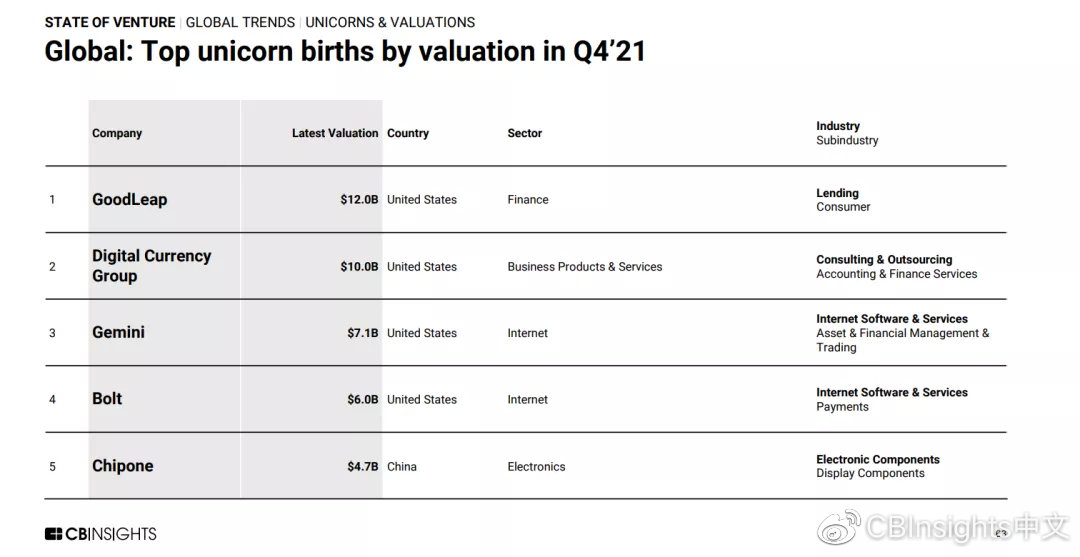 Q4 新晉獨角獸中,估值最高的 5 家公司分別是美國金融公司 GoodLeap、美國數(shù)字貨幣集團 Digital Currency Group、美國資產(chǎn)交易平臺 Gemini、電子商務(wù)支付服務(wù)商 Bolt 以及中國芯片設(shè)計公司 Chipone(集創(chuàng)北方)。