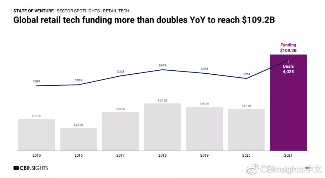 2021 年零售科技領(lǐng)域共完成 4028 筆融資交易,融資金額達到 1092 億美元,是 2020 年融資金額的兩倍多。