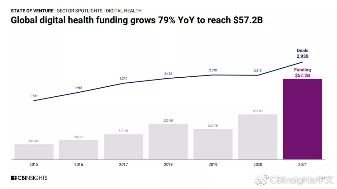 2021 年數(shù)字健康領(lǐng)域共完成 2930 筆融資交易,融資金額達到 572 億美元,比 2020 年融資金額增長了 79%。