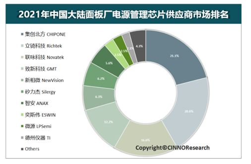 圖1:2021年中國(guó)大陸面板廠電源管理芯片供應(yīng)商市場(chǎng)排名,來(lái)源:CINNO Research