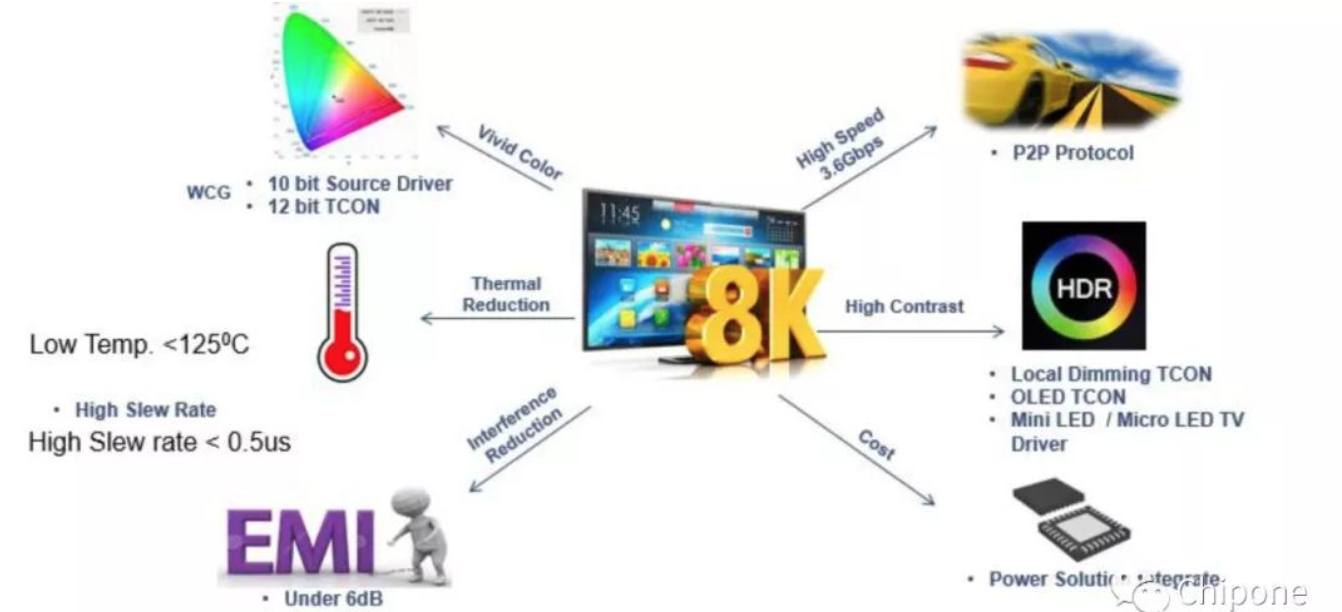 T-con芯片從110nm發(fā)展到8K的28nm,驅(qū)動IC從HD的180nm發(fā)展到8K的110nm,電源管理芯片(PMU)從0.35um發(fā)展到8K的110nm。