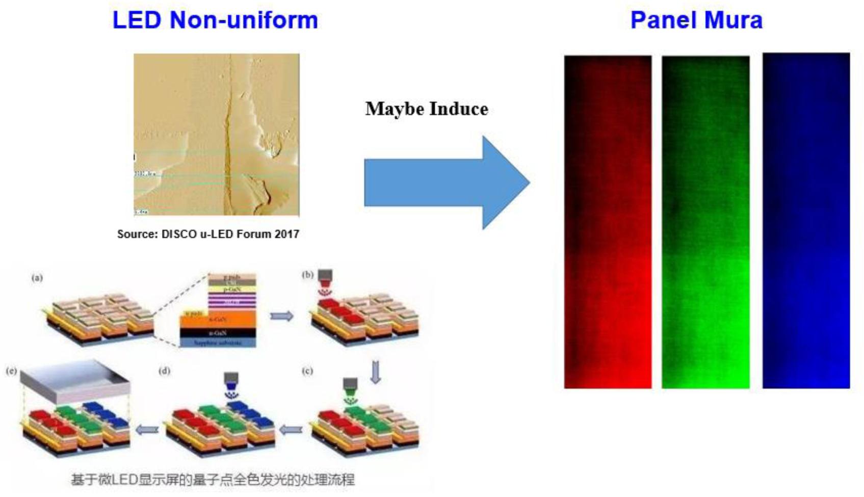 針對(duì)LED微型化制造過(guò)程中造成的LED發(fā)光不均勻問題,集創(chuàng)北方提出了將De-mura的圖像亮度補(bǔ)償技術(shù)引入到Micro LED的技術(shù)方案中來(lái)。通過(guò)光學(xué)儀器拍攝不同灰階下的面板亮度并采用De-mura算法處理和數(shù)據(jù)壓縮,可以提升面板的均勻度。