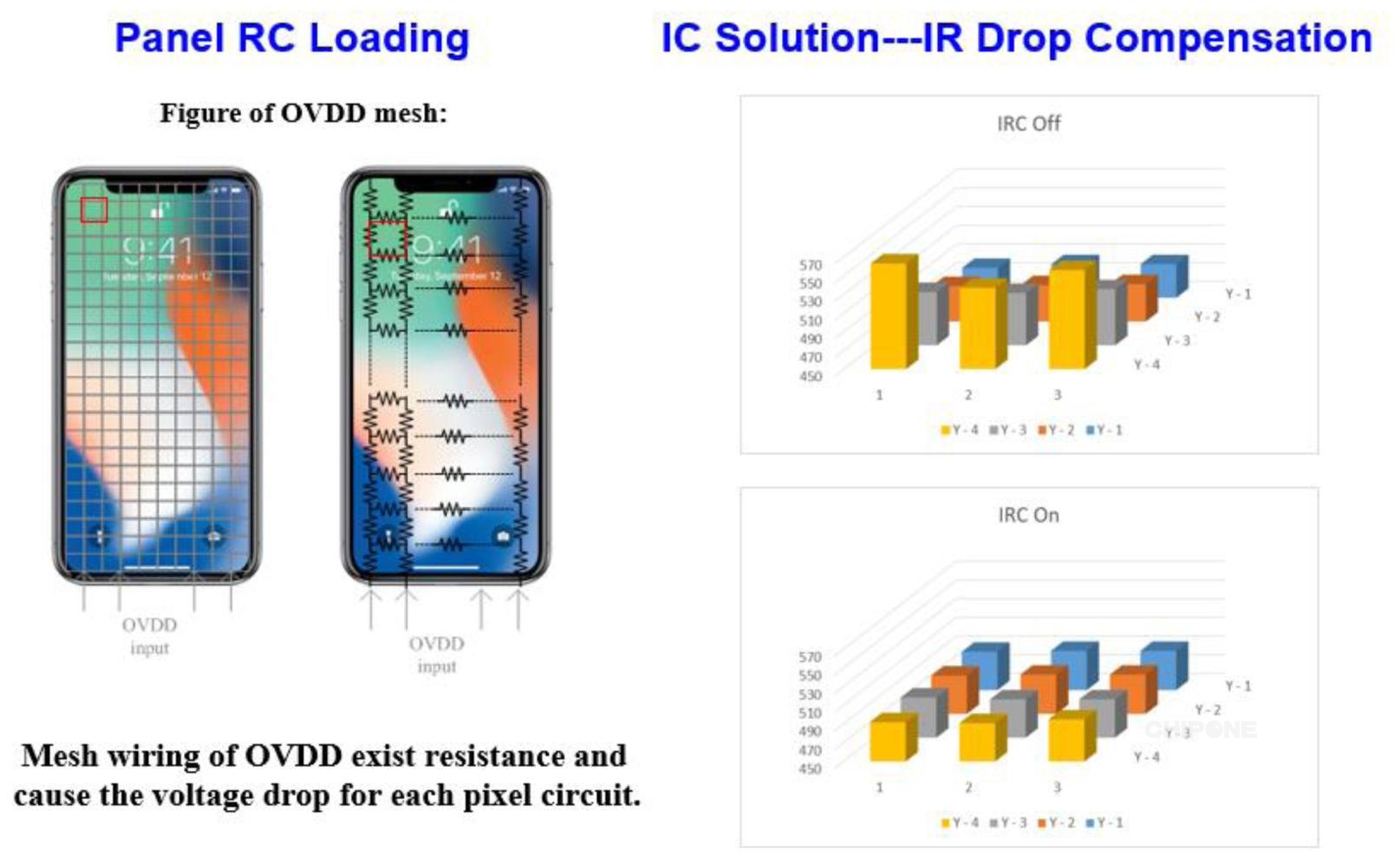 針對(duì)TFT背板技術(shù),IC可以提供IR drop Compensation的補(bǔ)償算法技術(shù),用于補(bǔ)償面板內(nèi)部由于金屬走線過(guò)長(zhǎng)而造成的面板走線的電阻過(guò)大,從而引起電流衰減的問題。