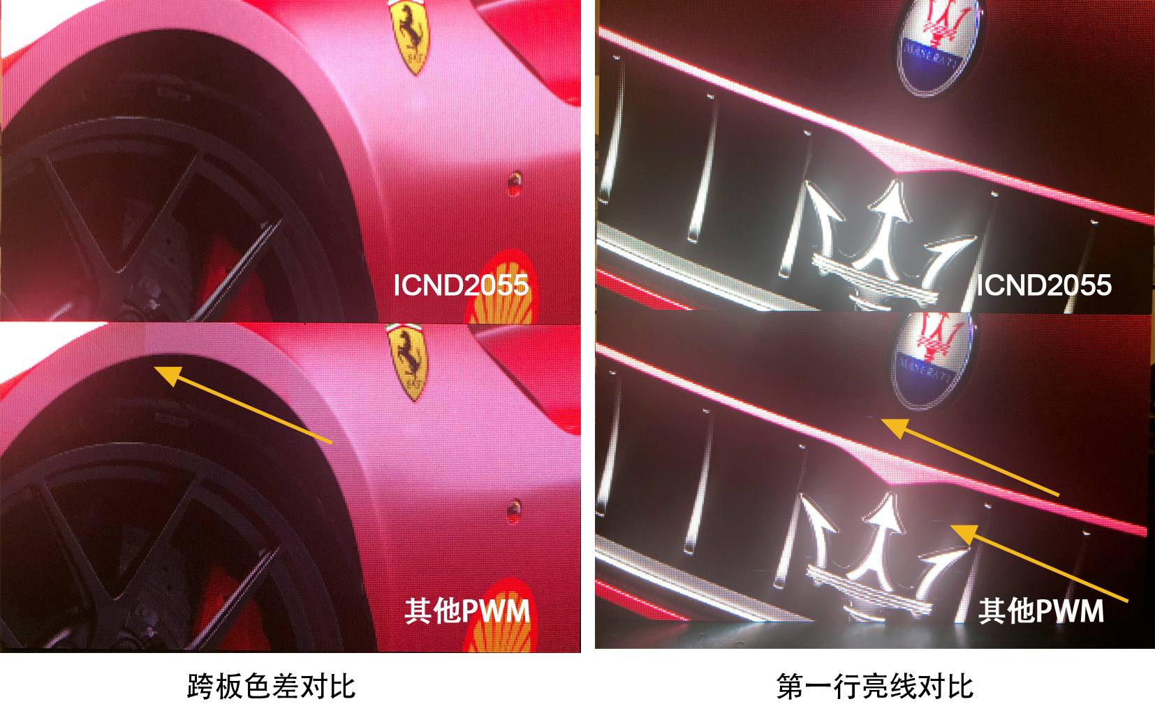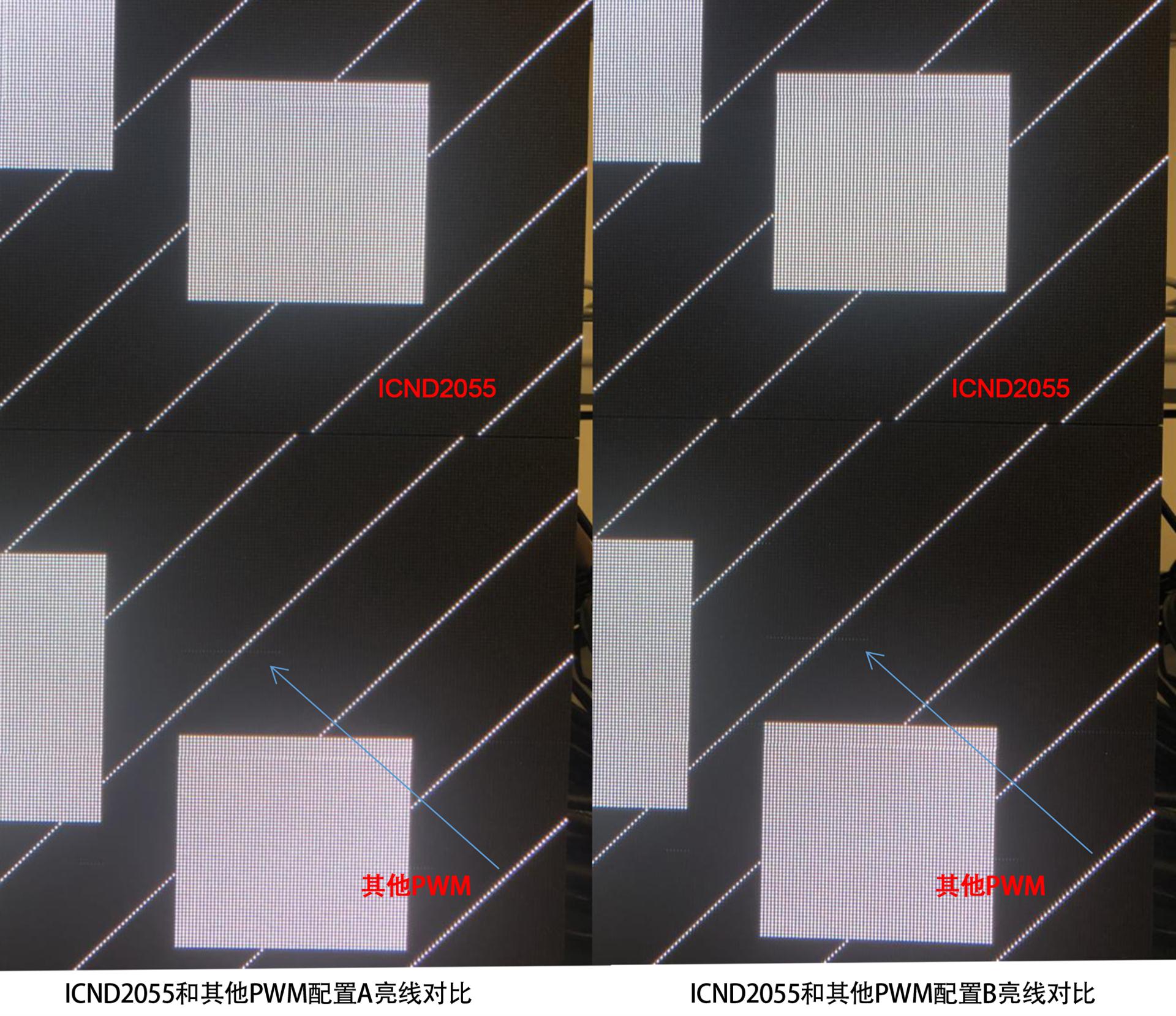 a. ICND2055同其他PWM為1920Hz,13bit的配置條件下時ICND2055對比度更高,低灰更暗;