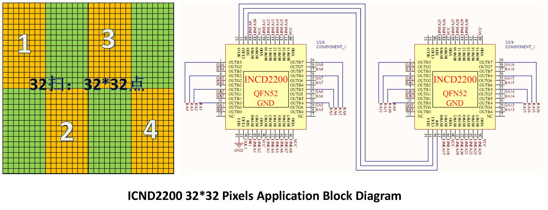 ICND2200采用創(chuàng)新的行列合一架構(gòu),內(nèi)部集成24個(gè)恒流通道及16個(gè)行管,通過(guò)芯片級(jí)聯(lián)可擴(kuò)展實(shí)現(xiàn)最大到32掃的區(qū)域控制,未來(lái)可升級(jí)到支持48掃和64掃。芯片級(jí)聯(lián)區(qū)域中行列共用組成控制區(qū)域,16掃應(yīng)用下,單顆芯片控制區(qū)域?yàn)?6行*8列;對(duì)應(yīng)32掃,兩顆芯片級(jí)聯(lián)控制區(qū)域?yàn)?2行*16列,下圖為32*32點(diǎn)控制區(qū)域示意圖,只需4顆ICND2200級(jí)聯(lián)擴(kuò)展即可。