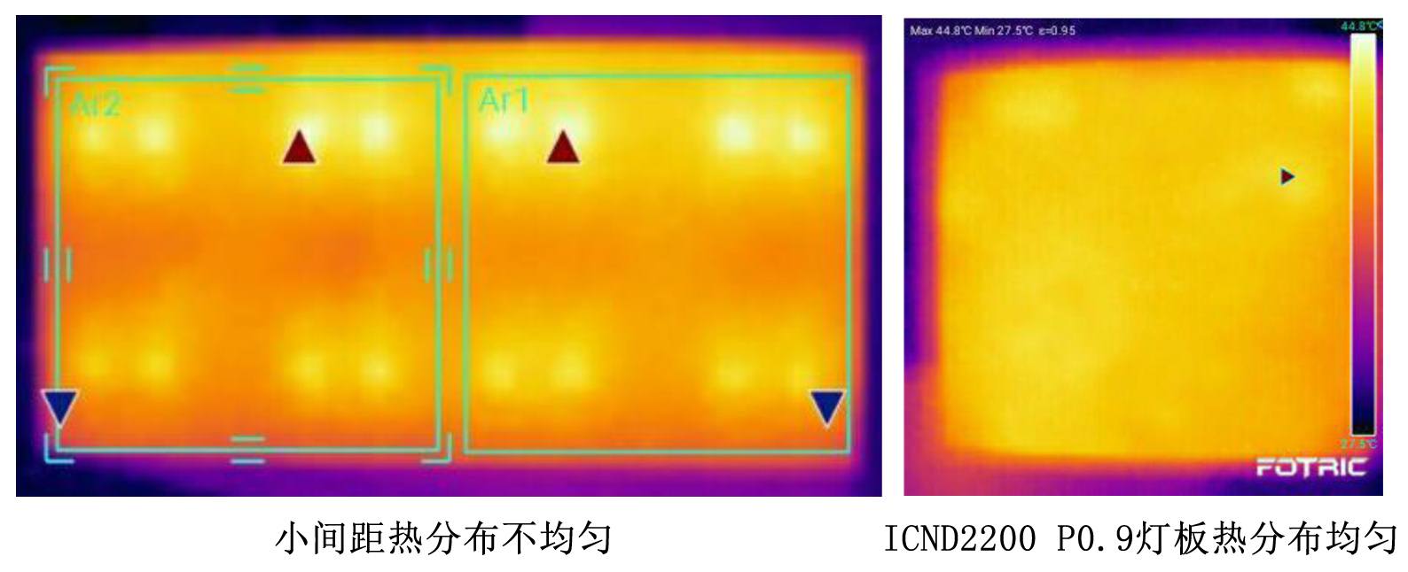 燈板溫度散熱不均是困擾LED小間距的另一大問(wèn)題,由于通常行線設(shè)計(jì)一行帶載燈珠較多的原因,通常在大屏模組間有偏青問(wèn)題,由于紅色燈珠電流大,往往紅色芯片處也是模組溫度最高的地方。目前,由于驅(qū)動(dòng)方案的局限性,燈板熱分布不均問(wèn)題始終無(wú)法得到改善。而ICND2200采用分區(qū)域方式,可均勻分開散熱,從而有效解決熱分布不均問(wèn)題,進(jìn)一步提高了燈板的穩(wěn)定可靠性。