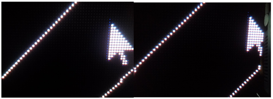 下圖為ICN2038與某友商產(chǎn)品在消鬼影方面的對(duì)比??梢园l(fā)現(xiàn):?jiǎn)为?dú)斜線測(cè)試時(shí),兩款產(chǎn)品都可以消除上下鬼影。但是,在斜線上疊加鼠標(biāo)后,競(jìng)爭(zhēng)產(chǎn)品在同一行出現(xiàn)鬼影,而ICN2038沒有。