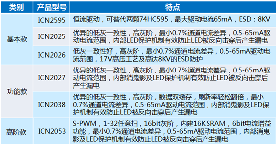 集創(chuàng)還先后推出了ICN2025、ICN2027、ICN2038、ICN2012、ICN2053等新產(chǎn)品,形成了高、中、低端全面覆蓋的LED顯示產(chǎn)品組合。其中ICN2053是小間距LED顯示屏恒流驅(qū)動(dòng)器的首選,它專為1/32掃以內(nèi)掃描屏設(shè)計(jì)的內(nèi)建SPWM及16K SRAM恒流驅(qū)動(dòng)器,具有高精度寬范圍電流輸出,14Bit PWM灰階控制,內(nèi)建鬼影消除電路、LED保護(hù)電路及6位電流增益功能。